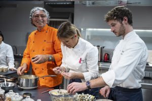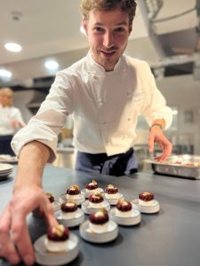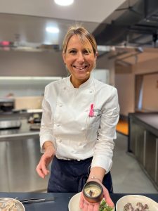 Invités par le Chef triplement étoilé Régis Marcon pour l’inauguration de son exposition « Bonnes Tables, Belles Tables », dédié aux arts de la table et l’art du service à table, la Cheffe Eugénie Guillermin a réalisé une bouchée salée « Œuf de caille presque parfait en montagne » : œuf de caille de la Dombe cuit basse température accompagné d’une crème de pomme de terre au lard et d’une émulsion de raclette de la Guillotière.