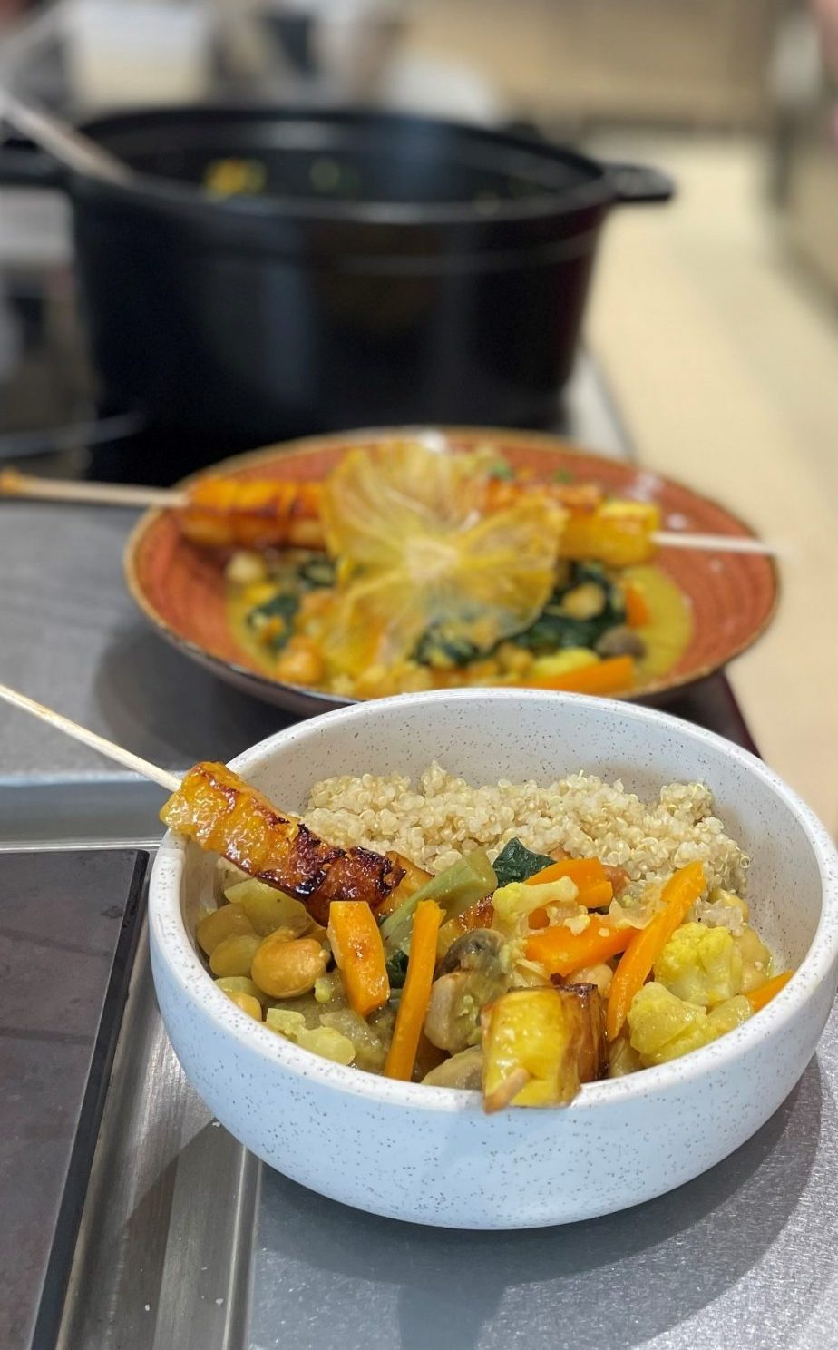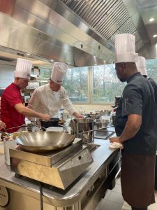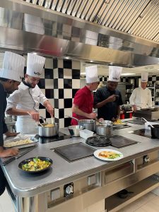 Leur formation s’est ensuite poursuivie en cuisine aux côtés de notre Chef Jean-Paul Naquin et Nicolas Tête, Docteur en Sciences et Diététicien-Nutritionniste, pour découvrir de nouvelles recettes et techniques et parfaire leurs connaissances des produits afin de proposer, au sein de leur établissement, une offre végétarienne équilibrée et attrayante qui respecte les apports en protéines végétales, féculents et légumineuses.