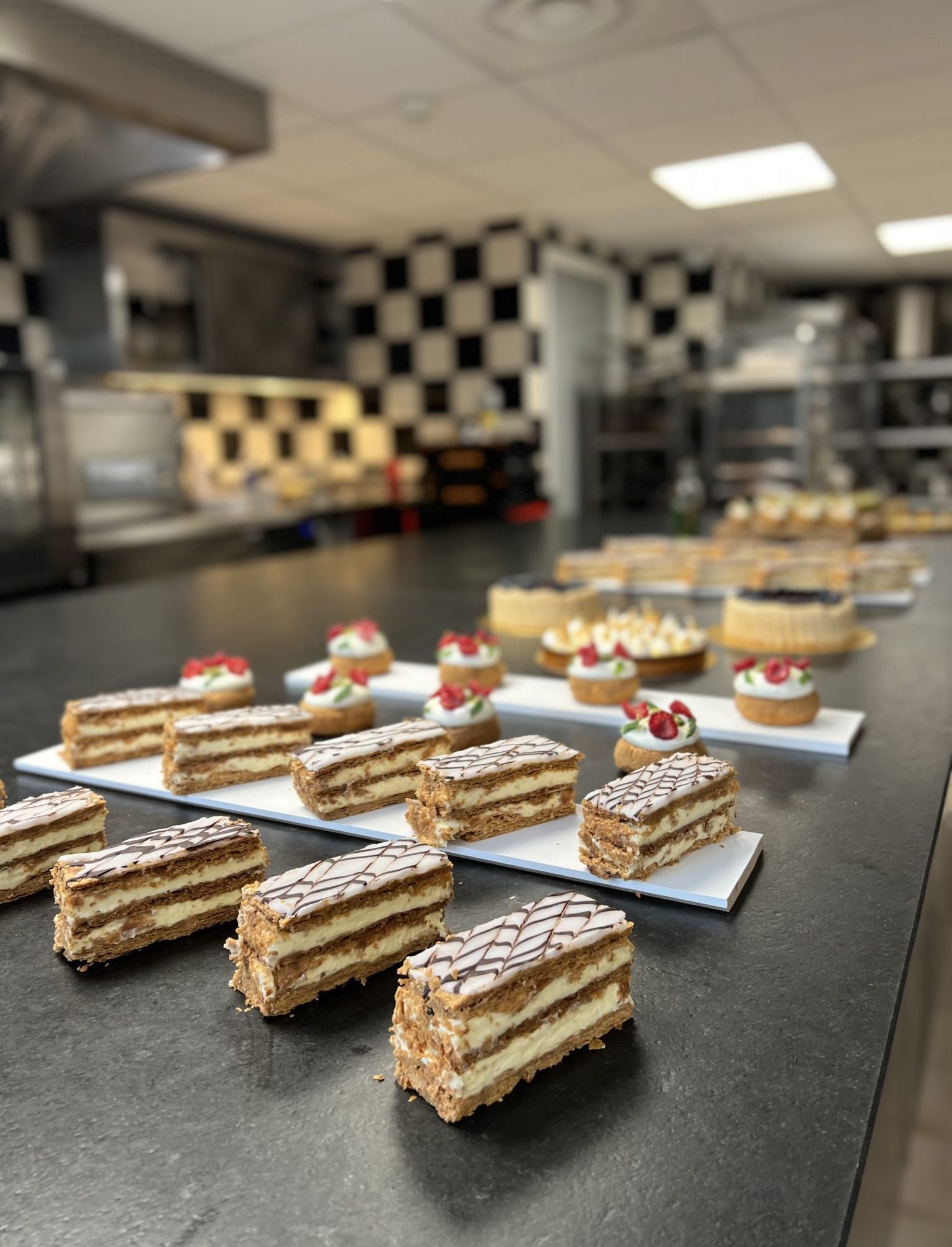 Après 5 semaines de formation en pâtisserie aux côtés du Chef Charles Liets, les stagiaires du programme de reconversion « Pâtisserie & Horizon » ont effectué leur évaluation finale devant un jury composé de professionnels et non professionnel :
