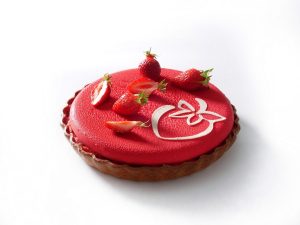 Tarte vanille fraise, dréssée comme un entremet, pâte sucrée, frangipane citronnée, crémeux vanille intense, compotée et mousse de fraise et son biscuit cuillère.